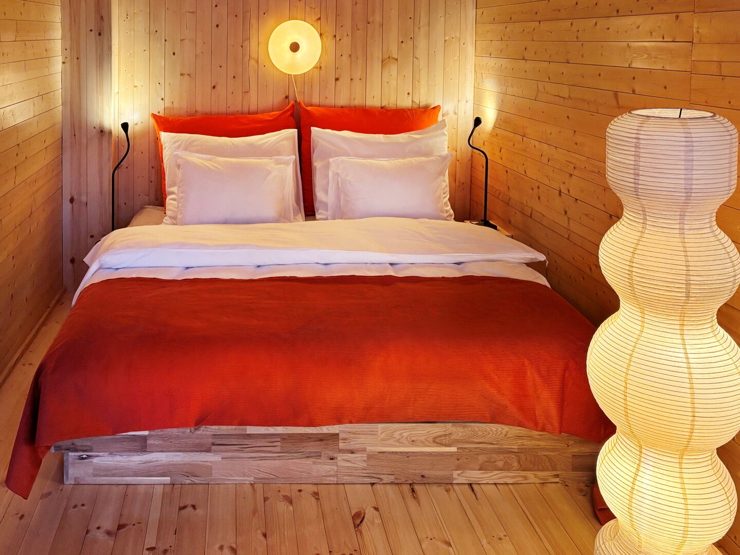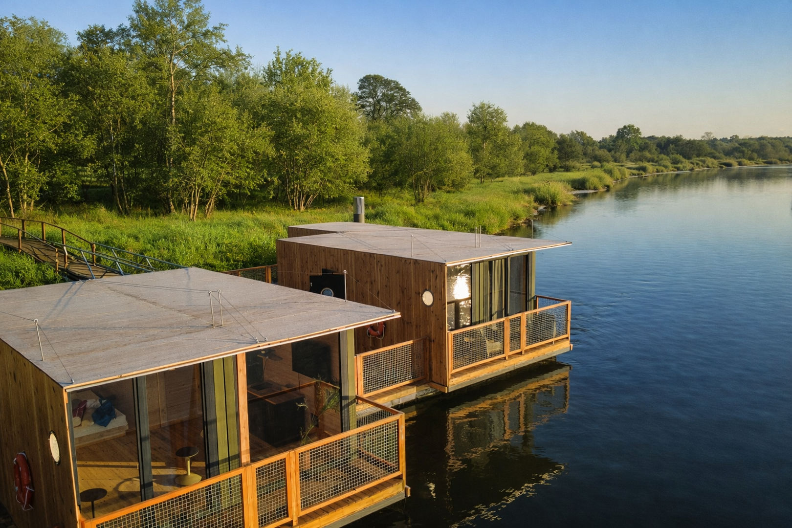 Cały kompleks zaprojektowany został w zrównoważonym stylu, z dużym naciskiem na naturalne materiały i prostą formę. Wnętrza domków wykończone są drewnem i utrzymane w stonowanej kolorystyce, co tworzy spokojne, neutralne tło do odpoczynku. Każdy domek posiada prywatny taras - w ogrodzie lub na wodzie - który stanowi integralną część przestrzeni mieszkalnej i pozwala spędzać czas na zewnątrz od rana do wieczora.