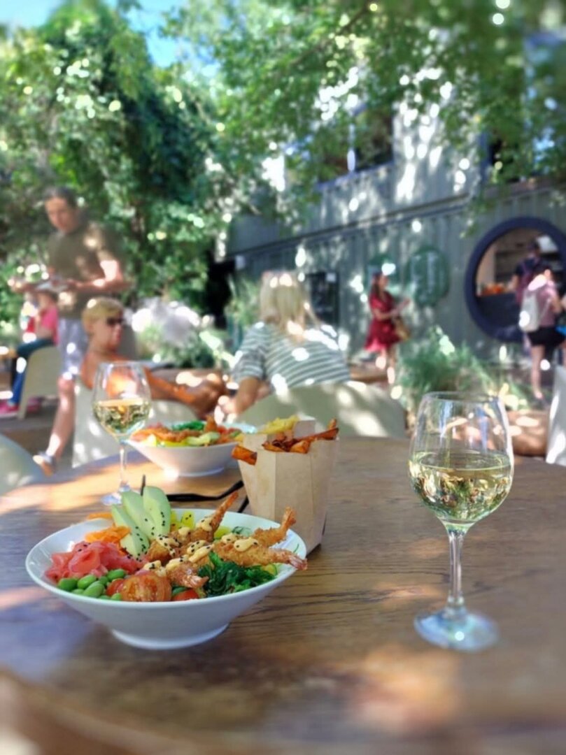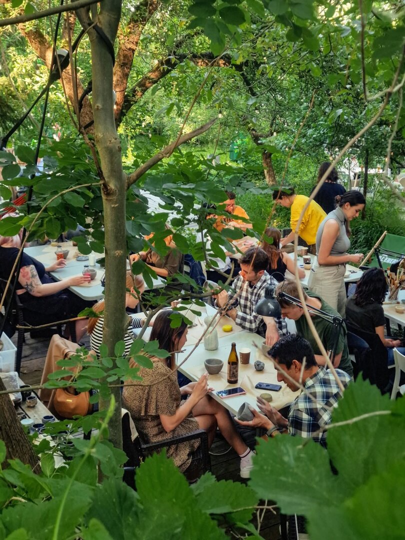 Przestrzeń wspólna obejmuje duży ogród przy przystani, przeznaczony do relaksu, spotkań i wieczornych ognisk, z możliwością grillowania. Miejsce dobrze sprawdza się zarówno na wyjazdy we dwoje, jak i na pobyty w gronie znajomych, z wynajęciem kilku domków jednocześnie. Dostępne są kajaki, rowery oraz możliwość organizacji rejsów barką rzeczną. Goście mogą także brać udział w warsztatach rzemieślniczych: ceramicznych, farbowania tkanin i gry na bębnach. W sezonie letnim na terenie obiektu działa restauracja z barem, w której odbywają się kameralne koncerty i wydarzenia artystyczne.