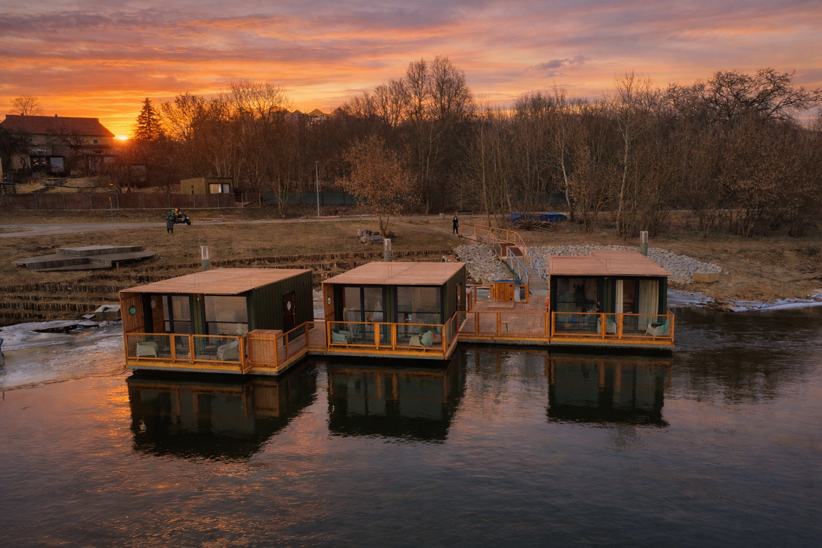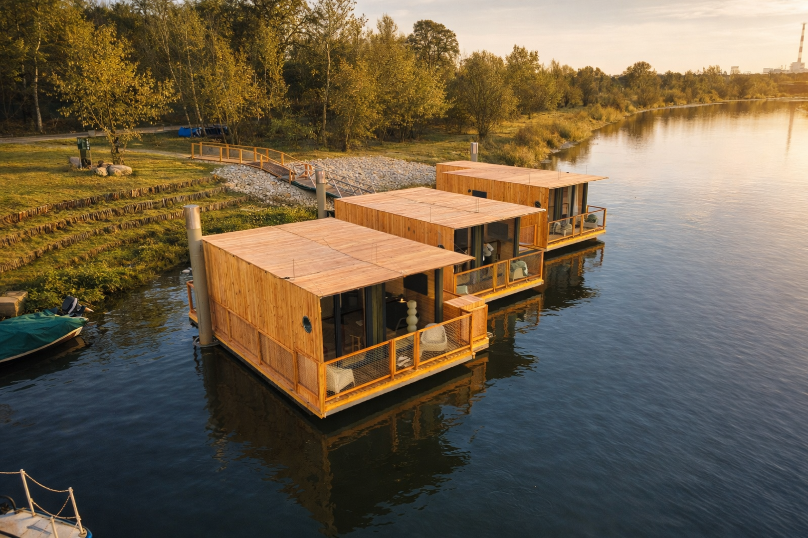 Na terenie znajduje się siedem nowoczesnych domków: cztery położone w ogrodzie, z widokiem na rzekę, oraz trzy unikatowe domki na wodzie, usytuowane bezpośrednio na tafli rzeki Warty. Domy na wodzie umożliwiają mieszkanie tuż nad nurtem - z prywatnym tarasem, z którego widać zmieniające się światło dnia, ruch wody oraz życie toczące się nad rzeką. To rzadko spotykana forma noclegu w mieście, oferująca ciszę i prywatność.