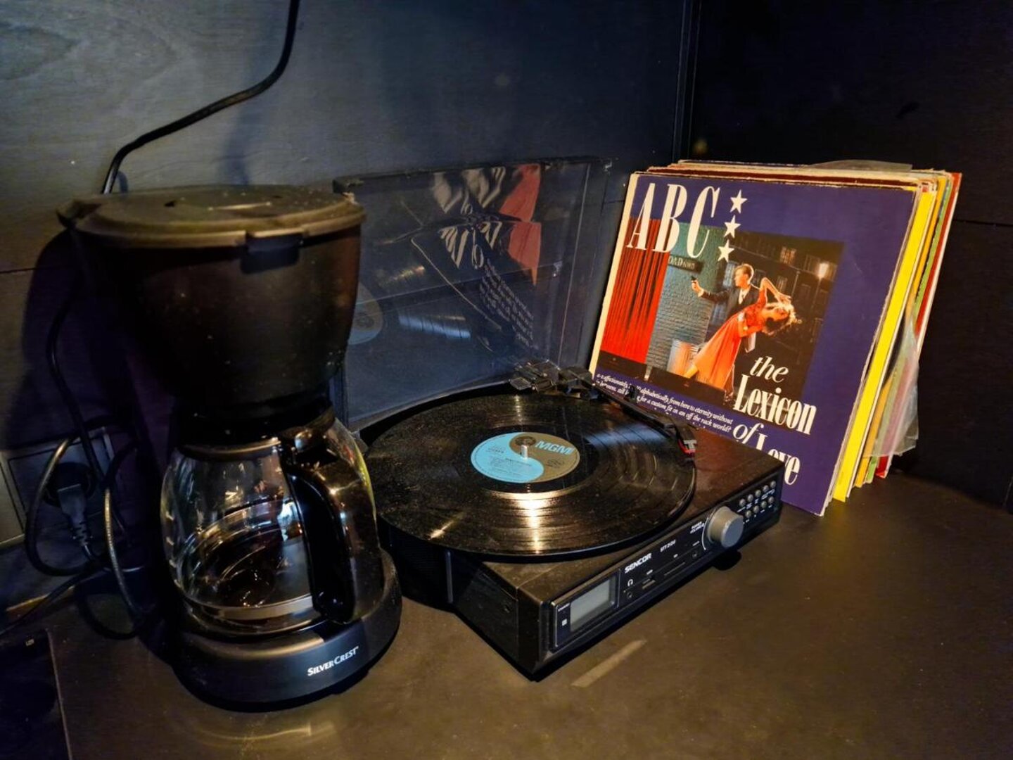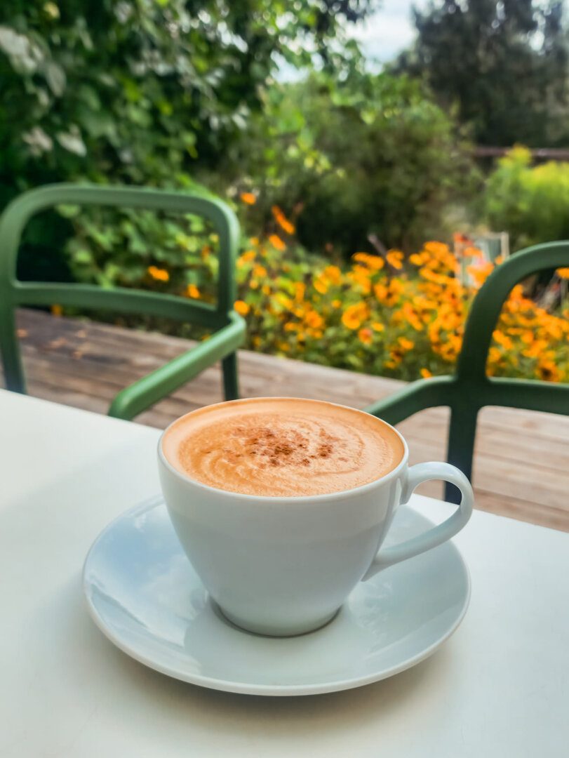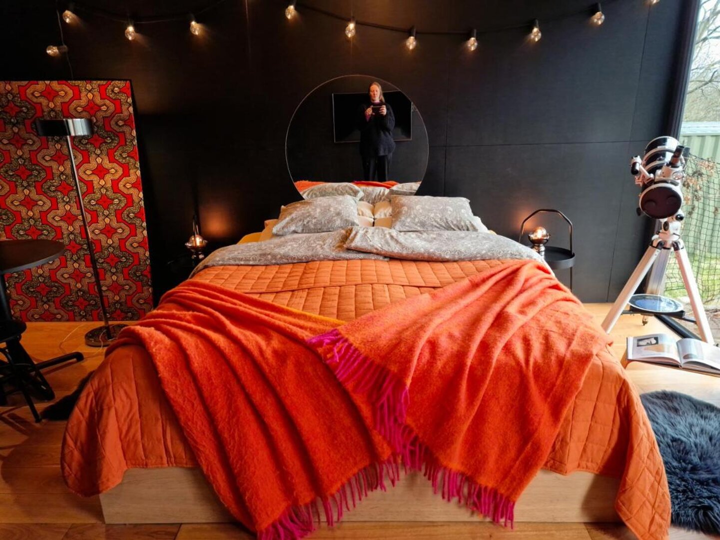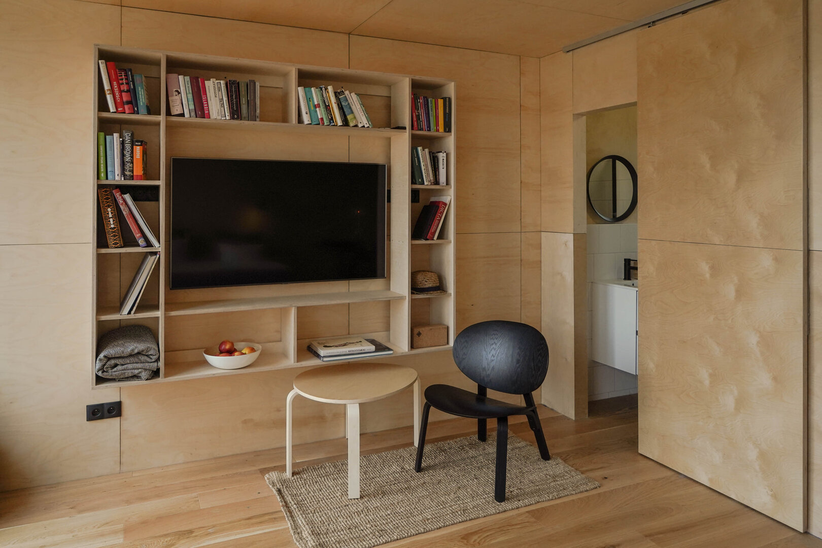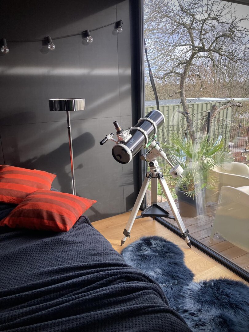 Domek w ogrodzie ma powierzchnię 30 m2, składa się z jednego pomieszczenia, aneksu kuchennego z płytą indukcyjną i łazienki z prysznicem. Klimatyzacja daje komfort latem i zimą. W domku na półkach stoi kolekcja albumów i książek.
